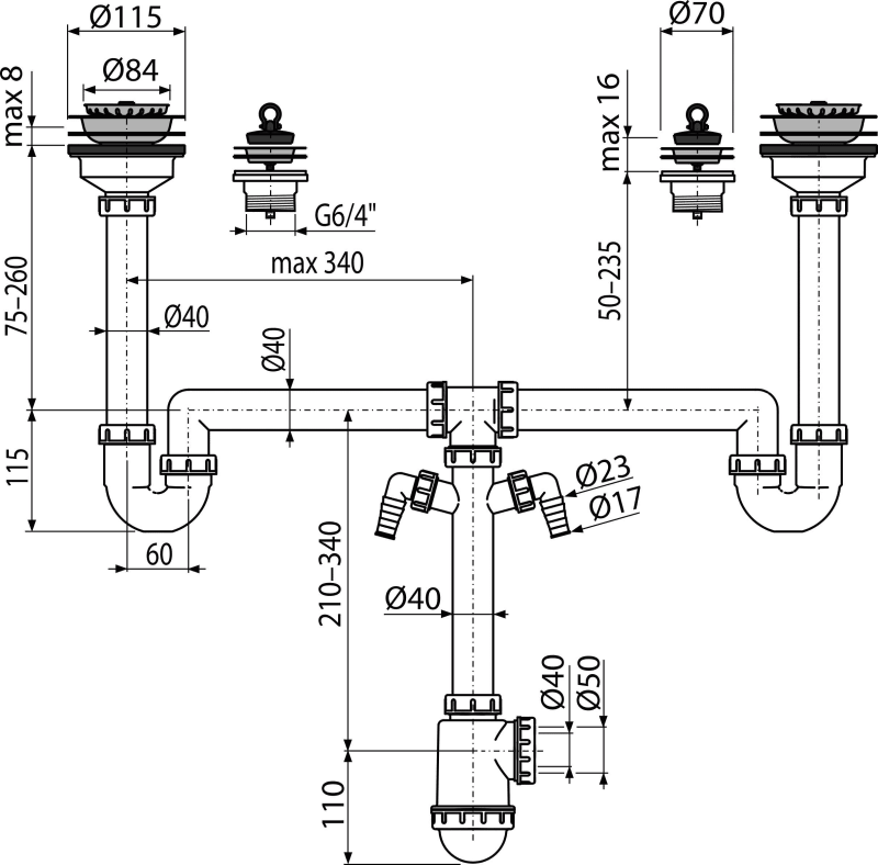 - Jednotlivé části lze použít jako náhradní díly pro dřezové sifony