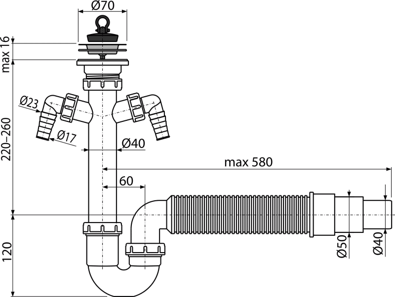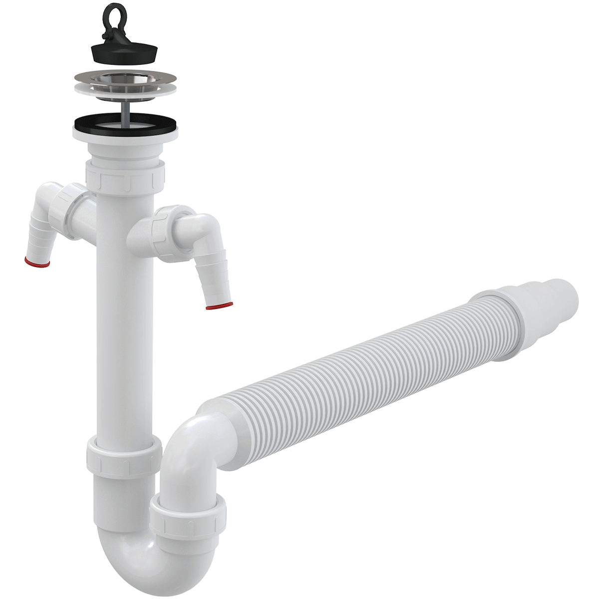 Sifon trubkový s nerezovou mřížkou DN70, dvěma přípojkami a flexi hadicí