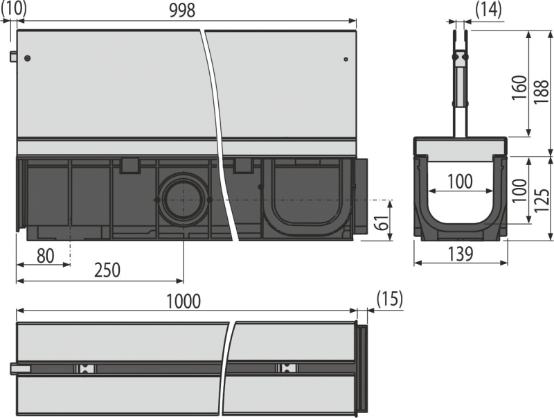 Venkovní žlab štěrbinový se symetrickým nástavcem 160 mm, nerez