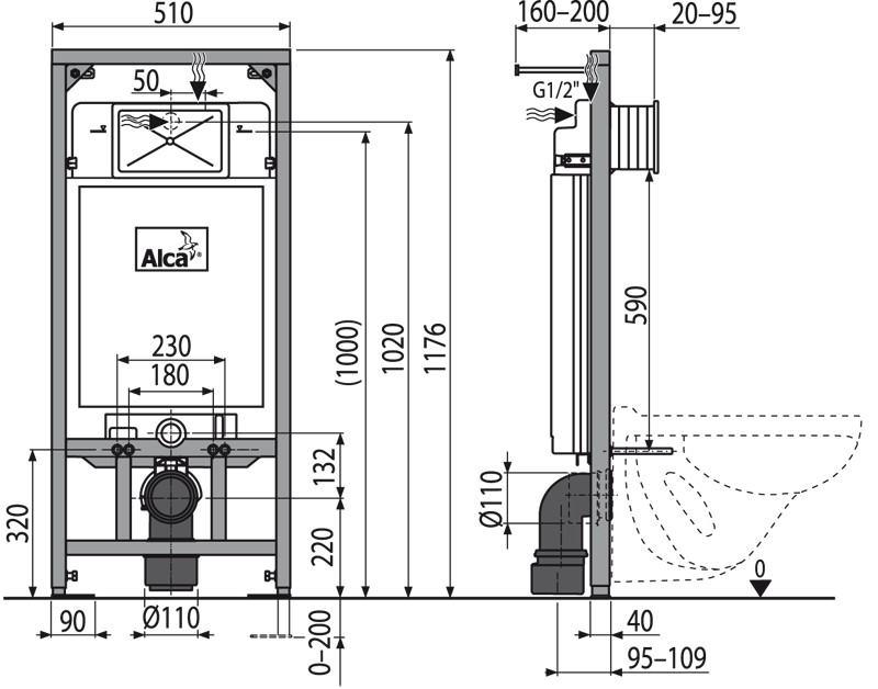 • Pro montáž závěsného WC s připojovací roztečí 180 mm nebo 230 mm